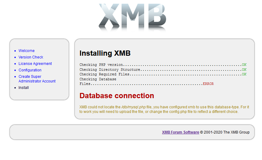 | Description | Hi, Getting issue while install of XMB 1.9.12.00 after "Create Super Administrator Account" XMB could not locate the /db/mysql.php file, you have configured xmb to use this database-type. For it to work you will need to upload the file, or change the config.php file to reflect a different choice. I checked and i found there is no such file exist in XMB | ||||