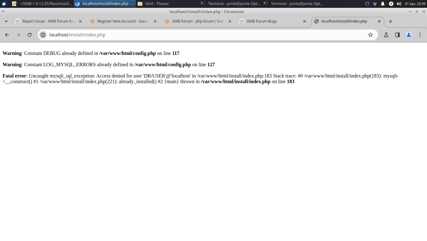 | Description | Because the install script attempts to try a database connection to the example parameters stored in the example config.php file (the one when you download XMB from the website, XMB-1.9.12.05.zip), and doesn't check whether the values are unchanged from the placeholder ones before doing so, there's a MySQL error upon trying to open the installer. | ||||