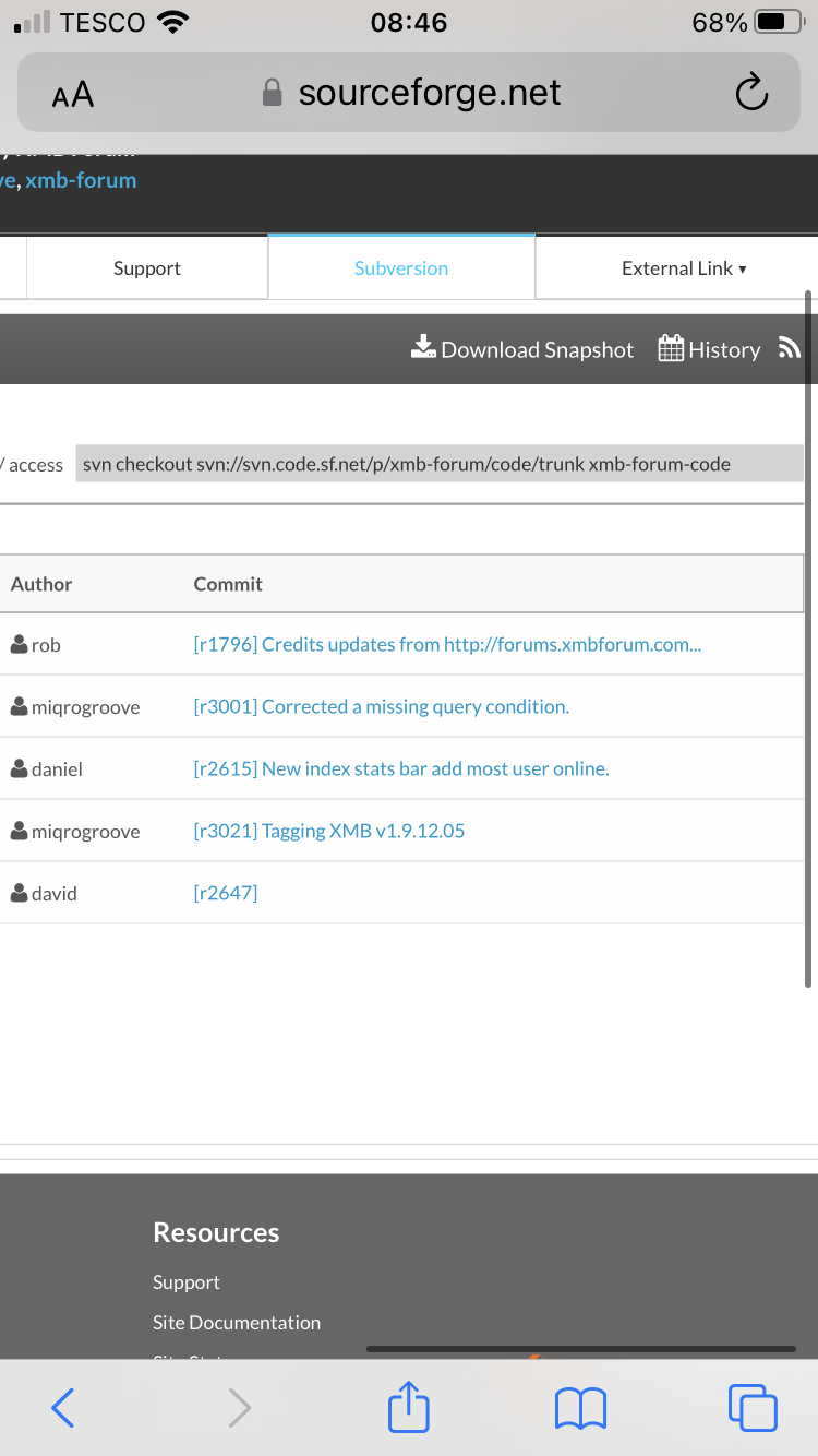 Yup, I was trying to access the one mentioned in the sourceforge page for copying to a terminal window: svn checkout svn://svn.code.sf.net/p/xmb-forum/code/trunk xmb-forum-code I've never used subversion before so I just assumed I was doing something wrong or the mentioned thing in the sourceforge page was old. |